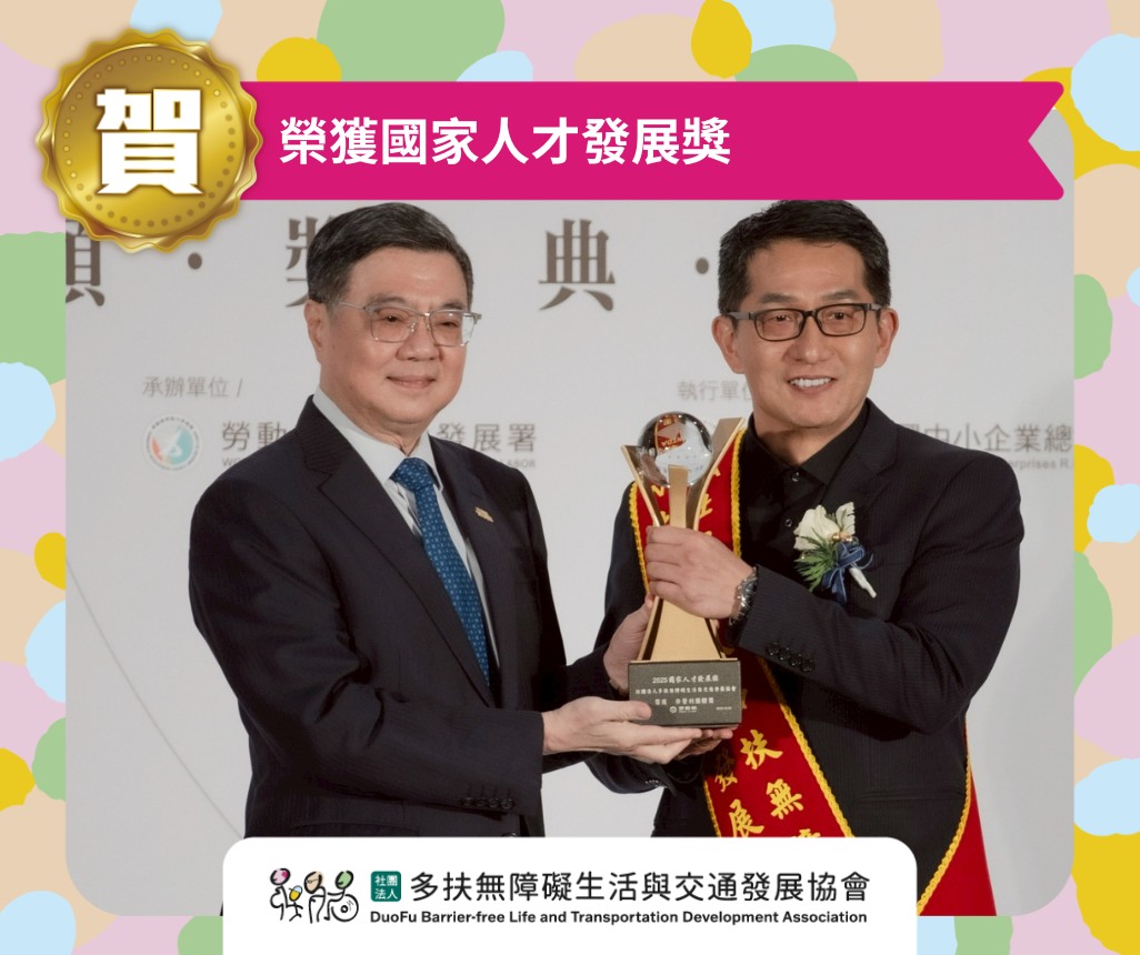 2025 國家人才發展獎於12/4隆重揭曉,社團法人多扶無障礙生活與交通發展協會自全國超過117家企業機關組織中脫穎而出,榮獲「非營利團體獎」,肯定其在無障礙服務人才培育、制度化品質管理與身心障礙者友善服務推動上的卓越成果。由多扶協會理事長許佐夫先生接受行政院院長卓榮泰頒獎,此次獲獎也象徵多扶協會在「人才×制度×共融實踐」三軌並進的影響力,已成為臺灣推動無障礙與高齡友善的重要示範。以TTQS×無障礙訓練×全方位共融實踐